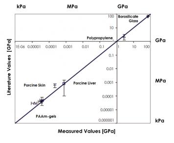NanoTest 納米力學(xué)測試系統(tǒng)的液體池模塊能對(duì)生物材料、組織、細(xì)胞器、細(xì)胞層、軟骨、靜電支架、牙釉質(zhì)等在液體環(huán)境中進(jìn)行力學(xué)性能表征,不僅為生物材料以及組織研究人員和工程師提供完美的解決方案,也是組織工程和再生醫(yī)學(xué)的研究者衡量他們感興趣材料剛度的良好選擇。 例如:研究生物材料大范圍的剛度值:麻省理工學(xué)院的研究表明,納米測試液體細(xì)胞的納米壓痕可以在樣品完全浸入液體的情況下進(jìn)行,從高度柔順的凝膠到生物組織,材料的硬度跨越幾個(gè)數(shù)量級(jí)。
