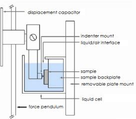 NanoTest在納米力學(xué)測試系統(tǒng)上加入了液體池模塊,可以對(duì)完全浸入液體池中的樣品進(jìn)行納米壓痕、納米劃痕和磨損測試,摩擦傳感器也可使浸入樣品進(jìn)行摩擦測量。該液體池采用現(xiàn)有的擺設(shè)計(jì),水平加載在流體測試中具有以下優(yōu)勢:a、浮力恒定,b、恒定表面張力,c、液體不經(jīng)過電容器之下。