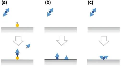 圖2 化學(xué)吸附機制示意圖。(a)配體交換;(b)解離吸附;(c)非解離吸附。