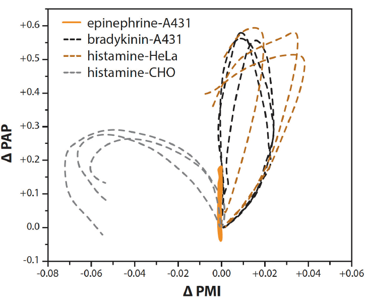 圖4:雙參數(shù)PMI-PAP反應(yīng)譜,其中PAP(峰值角位置)反應(yīng)與PMI(峰值最小強(qiáng)度)反應(yīng)相對(duì)應(yīng),顯示不同激動(dòng)劑和細(xì)胞系的明確可區(qū)分模式。