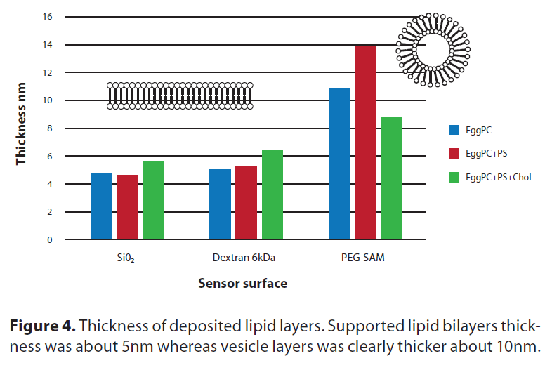 即使6kDa葡聚糖和PEG-SAM都是相對(duì)較薄(幾納米)的親水凝膠載體,葡聚糖表面明顯促進(jìn)SLB的形成,而PEG-SAM支持SLV的形成。計(jì)算的厚度和RI值顯示右旋糖酐上的脂質(zhì)層與PEG-SAM上的脂質(zhì)層有明顯差異(圖4)。表面促進(jìn)行為的差異很可能是由于聚合物親水性基團(tuán)的密度和位置不同。右旋糖酐支持所使用的三種脂質(zhì)組合物的脂質(zhì)雙層形成(圖4)。