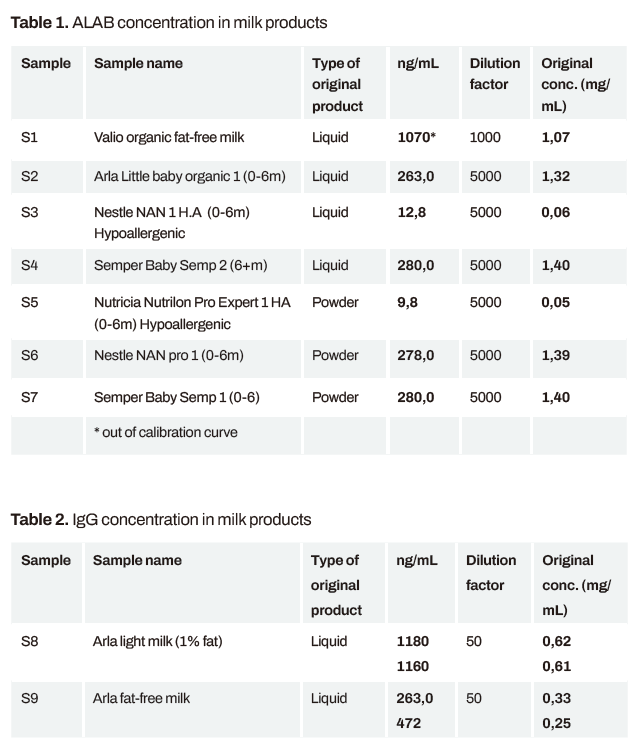 樣品是從芬蘭超市購買的不同的奶制品(圖1)。粉末樣品根據(jù)包裝上的說明制備成液體形式,并進(jìn)一步稀釋1000或50倍(正常牛奶)和5000倍(嬰兒產(chǎn)品)。使用90秒的樣品注射(校準(zhǔn)或牛奶樣品),120秒的等待時(shí)間和60秒的ALAB再生注射進(jìn)行測(cè)量。IgG注射時(shí)間較長(zhǎng)。ALAB的校準(zhǔn)范圍為0 - 1000 ng/mL, IgG的校準(zhǔn)范圍為0 - 75 000 ng/mL。校正曲線符合4參數(shù)Low-High方程,也可用于測(cè)定樣品中的蛋白質(zhì)濃度。