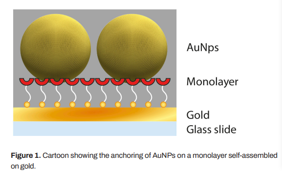 將金納米顆粒固定在自組裝的單層金上。單分子層鏈端上的官能團(tuán)促進(jìn)了金納米顆粒在層上的錨定。多參數(shù)表面等離子體共振(MP-SPR)可以實(shí)時(shí)測量金納米顆粒與表層的結(jié)合情況。