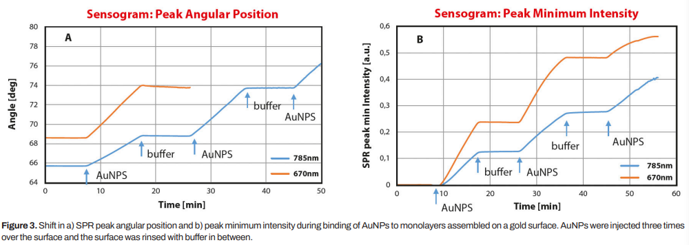 使用BioNavis SPR Navi?210A-L儀器在670和785nm兩個(gè)波長下測定AuNPs與表面單層的結(jié)合。用水沖洗單層表面,測定基線,以10 μL/min的速度在表面注入AuNPs,持續(xù)約10分鐘。AuNP注射三次,每次注射之間用水沖洗。