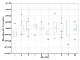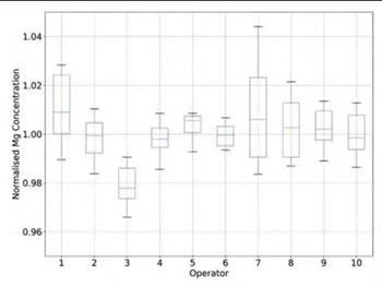 為了證明定量陰極熒光光譜法測(cè)定鎂摻雜量的可靠性,我們將測(cè)定結(jié)果與 SIMS 提供的結(jié)果進(jìn)行了比較。在對(duì)多個(gè)樣品進(jìn)行測(cè)量后,SIMS和定量陰極熒光測(cè)定的鎂參雜量的均方根誤差為3.8%。為了確定技術(shù)的可重復(fù)性,我們進(jìn)行了嵌套量具的可重復(fù)性和可靠性研究(見(jiàn)圖 5)。這項(xiàng)研究證實(shí)了定量陰極熒光測(cè)定法良好的可重復(fù)性,當(dāng)假設(shè) 60%的規(guī)格極限(目標(biāo) ±30%)和量具偏差低于 10%時(shí),在 100 次重復(fù)測(cè)量中標(biāo)準(zhǔn)方差低于 ±1%。